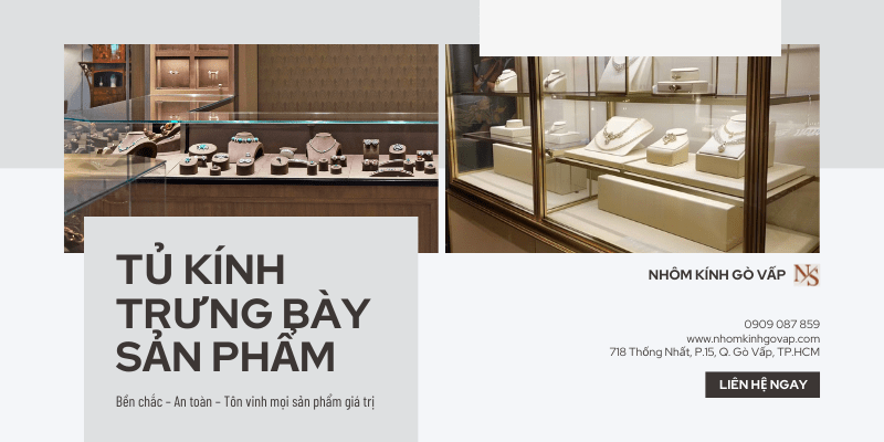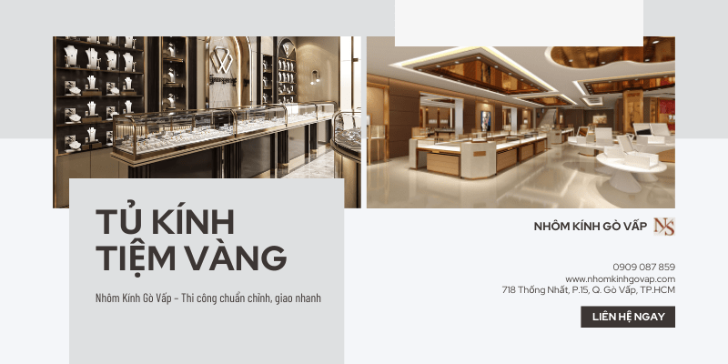 Tủ kính tiệm vàng sang trọng, an toàn, chuẩn thẩm mỹ. Giải pháp thi công cao cấp từ Nhôm Kính Gò Vấp. Kính cường lực - khung đẹp - độ bền tối đa.